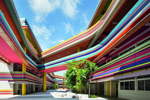 這種紅土的暖色系外觀已經(jīng)足夠引人注目了,但是如果你需要進(jìn)一步的證據(jù)來表明建筑師正在徹底打破老套的“去色化”設(shè)計(jì),這里倒有一個足夠多彩的建筑設(shè)計(jì)可供參考。也許最有活力的建筑當(dāng)屬Nanyang小學(xué),這是Studio505的一個設(shè)計(jì)項(xiàng)目,它那如糖果般多彩的立面“展現(xiàn)了充滿活力的,無拘無束的自由思想,為孩子和老師們帶來喜悅和興奮。”這是一座連整天沉著臉的密斯凡德羅見了都會微笑的建筑。