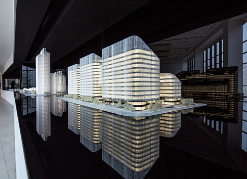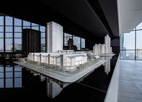 作為設(shè)計(jì)改造翻修項(xiàng)目,我們接到的設(shè)計(jì)任務(wù)期望保持客人踏入朝外SOHO11層SOHO中國(guó)總部的第一印象。對(duì)于SOHO總部現(xiàn)有入口設(shè)計(jì),我們十分欣賞,從電梯廳走出后的感受十分典雅明亮。與客戶(hù)溝通簽約后,我們將開(kāi)放辦公區(qū)面對(duì)外臨面幕墻的空間進(jìn)行了全新改造,并賦予重要的意義。兩側(cè)部分嵌入式的弧形墻體環(huán)繞著建筑模型展示區(qū),呈現(xiàn)了SOHO中國(guó)發(fā)展歷程中的標(biāo)志性建筑和樓體模型。一條嵌入式的紐帶,鑲嵌者黑色玻璃,與純白色的由著名建筑事務(wù)所如Zaha Hadid,GMP等打造的建筑樓體模型,形成了黑白強(qiáng)烈的反差,也讓展示的模型更加引人注目。