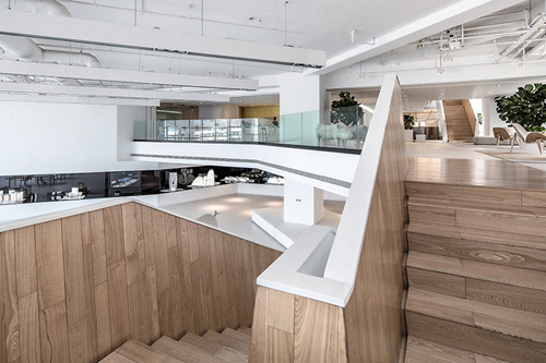 15層為行政樓層,樓梯延伸至上的側(cè)面為白色鐳射切割穿孔金屬板。設(shè)計(jì)師期望在樓梯和外臨面之間的開(kāi)放空間展示SOHO中國(guó)過(guò)往特別的項(xiàng)目,于是造就了從天花懸吊延伸至下的SOHO長(zhǎng)城腳下的公社白色建筑模型,在路過(guò)的人們視野中若隱若現(xiàn)。同時(shí)從穿孔金屬板中灑進(jìn)的陽(yáng)光,打造了或明或暗的奇特陰影,呈現(xiàn)在模型的頂上十分有趣。