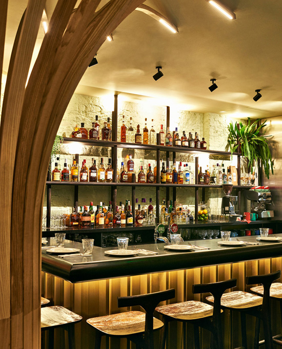餐廳的酒吧藏有各種不同種類的牙買加朗姆酒,其豐富程度堪稱倫敦之首。為了突出這一特征,設(shè)計(jì)師仿照燒焦的收割前的甘蔗地設(shè)計(jì)了一款擱架系統(tǒng),用燒焦的木棍作為合板釘穿插在多層擱板中,在微妙的燈光下,琥珀色的朗姆酒瓶閃爍著醉人的光輝。吧臺(tái)正面由青銅制成,波狀起伏的形態(tài)同樣也參考了牙買加的建筑特征。