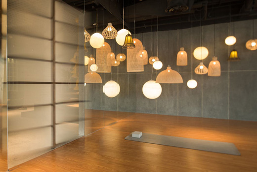 瑜伽教室通過一個巨大的旋轉(zhuǎn)門和8米長的折疊門被分成了不同的區(qū)域,在私密領(lǐng)域和公共區(qū)域之間形成一個良好的平衡。走進(jìn)瑜伽教室,形態(tài)各異的燈具和編制籃刻意的懸空,連同飄蕩在空中的瑜伽帶延伸至天花板,創(chuàng)造身臨其境的視覺效果,提高練習(xí)瑜伽的體驗(yàn)。