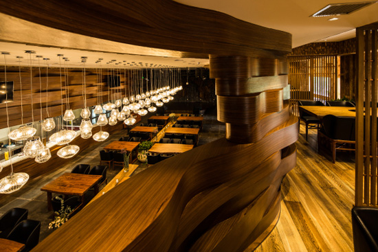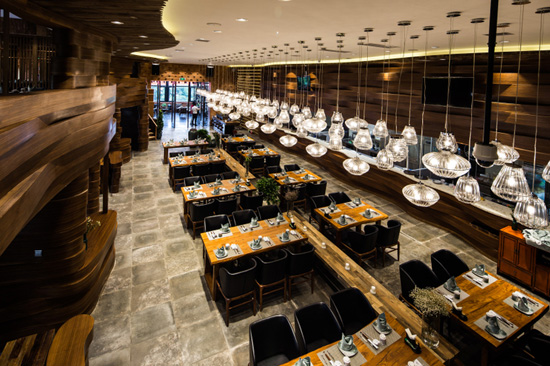 在整體的風(fēng)格上,以“海牧場”的名字作為延體,在“?!钡谋尘跋?,將其進(jìn)行場景化,想象漁民在清晨捕撈時的場景,濕滑的崖石,蜿蜒曲折的海岸線,海浪層層疊疊沖向懸崖激起浪花,何其壯觀。在描述壯闊海景的詩句里我們引用了曹操的《觀滄?!贰皷|臨碣石,以觀滄海。水何澹澹,山島竦峙?!庇纱?,在本案中運(yùn)用了曲線及崖石的表現(xiàn)形式,從不規(guī)則的大面積曲線面建連一層與二層,到樓梯踏步、大門、桌面都是用了木材自然的曲線將具象與抽象的表現(xiàn)融入整個空間。將曲線以不同的材質(zhì)與表現(xiàn)形式延伸到消費(fèi)者所能看到并能細(xì)微感受到的各個細(xì)節(jié)里。在一樓大廳主舞臺的背景墻面以及樓梯墻面上則使用具象的黑色表面不規(guī)則凸起的石材來體現(xiàn)崖石的感覺。一層大廳中央的玻璃吊燈則為了營造出海面浪花瑩瑩的光線感。