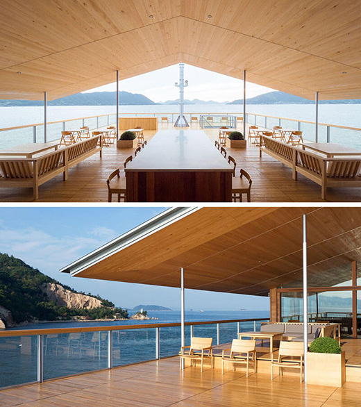 擁有「漂浮在瀨戶內(nèi)海上旅館」之稱的豪華渡輪——Gunt?,由建筑師Yasushi Horibe參與規(guī)劃設(shè)計(jì),船艙內(nèi)擁有19間敞舒適的客房,同時(shí)附設(shè)健身房、美容沙龍、咖啡廳酒吧。酒店擁有一個(gè)帶戶外休息室的大型屋頂平臺,一間酒吧和充足的空間,可欣賞到水景。還有一個(gè)室內(nèi)休息室,有一個(gè)醒目的尖頂木制天花板和弧形酒吧。木頭元素充滿整個(gè)酒店,除了木鑲板以及木地板,大部分家具也由木材制成。