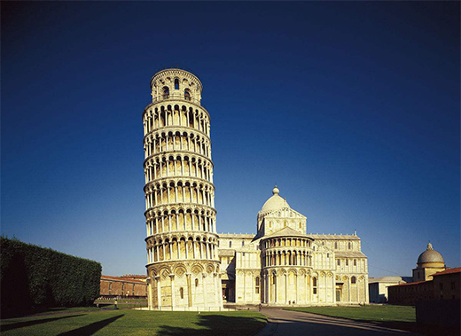 比薩斜塔位于意大利托斯卡納省比薩城北面的奇跡廣場(chǎng)上。廣場(chǎng)的大片草坪上散布著一組宗教建筑,它們是大教堂、洗禮堂、鐘樓和墓園,它們的外墻面均為乳白色大理石砌成,各自相對(duì)獨(dú)立但又形成統(tǒng)一羅馬式建筑風(fēng)格。比薩斜塔位于比薩大教堂的后面。比薩斜塔是比薩城的標(biāo)志,1987年它和相鄰的大教堂、洗禮堂、墓園一起因其對(duì)11世紀(jì)至14世紀(jì)意大利建筑藝術(shù)的巨大影響,而被聯(lián)合國教育科學(xué)文化組織評(píng)選為世界遺產(chǎn)。
