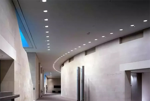 擦光與光洗最大的區(qū)別在于擦光更強(qiáng)調(diào)受光面材質(zhì)本身的質(zhì)感。而“擦”的方法,無(wú)非是將光源或者窄天窗安排在離受光面盡量近的地方,用最小的角度把光擦上去,利用平面本身的凹凸紋理制造出獨(dú)特的光影效果。這個(gè)方法即便是對(duì)付很平整的墻面,例如抹平的水泥墻,也同樣有效。用建筑評(píng)論常用的詞語(yǔ)說(shuō),就是會(huì)產(chǎn)生豐富的戲劇性(drama)。