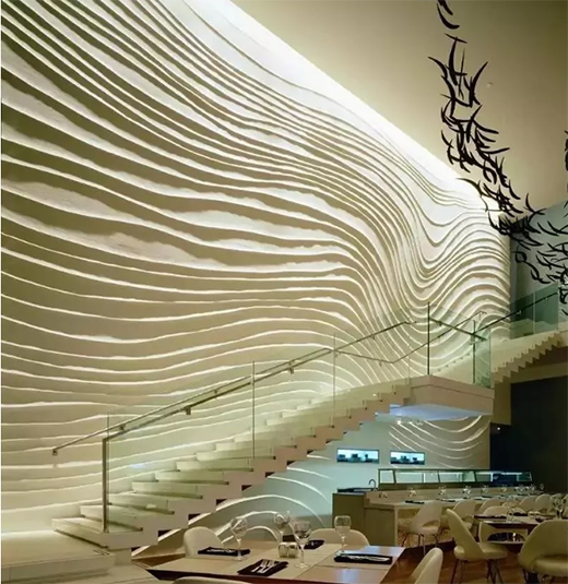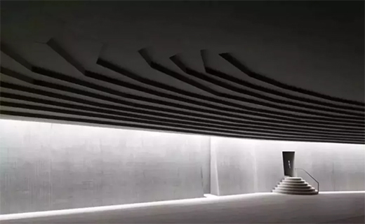 用一個(gè)比較極端的例子來(lái)說(shuō)明擦光的特點(diǎn):依賴高度紋理化的表面,例如凹凸不平的磚墻,或者上圖這種呈現(xiàn)某種立體樣式的墻面,產(chǎn)生光與影的激烈碰撞。當(dāng)客人順著墻走下樓梯,仿佛看到波濤起伏,海燕在翔集(“仿佛”在這里意味著藝術(shù)的抽象性,也是浪漫的源起),而發(fā)光的燈具也被吊頂很妥當(dāng)?shù)匮诓刈。粫?huì)跳出來(lái)煞風(fēng)景。這個(gè)例子不僅解釋了擦光手法,還解釋了什么是建筑學(xué)中的“戲劇性”。