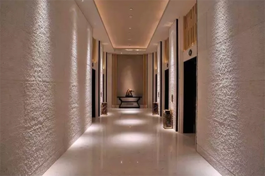 過道是連接酒店各功能空間的紐帶,起著承上啟下的作用。同時(shí),過道有時(shí)也被作為藝術(shù)品的展示區(qū)及休息區(qū),這也是設(shè)計(jì)對(duì)空間的延伸效果??头康淖叩雷詈媒o客人營造一種安靜安全的氣氛。燈光既不可太明亮,也不能昏暗,要柔和并且沒有眩光。