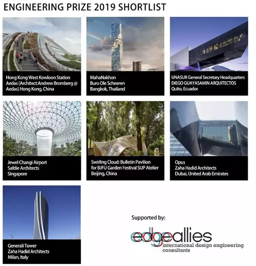 工程設(shè)計(jì)獎(jiǎng)同時(shí)進(jìn)入工程設(shè)計(jì)獎(jiǎng)短名單的有扎哈·哈迪德(Zaha Hadid)事務(wù)所的迪拜奧普斯城市綜合體, 賽福迪(Safdie)事務(wù)所的新加坡星耀樟宜機(jī)場(chǎng)、凱達(dá)建筑事務(wù)所(Aedas) 的香港西九龍火車(chē)站、奧雷·舍人事務(wù)所(Buero Ole Scheeren)的曼谷大都市(MahaNakhon)大廈、迭戈·瓜亞薩明事務(wù)所(Diego Guayasamin Arquitectos)的南美洲國(guó)家聯(lián)盟秘書(shū)處大樓等6個(gè)項(xiàng)目。