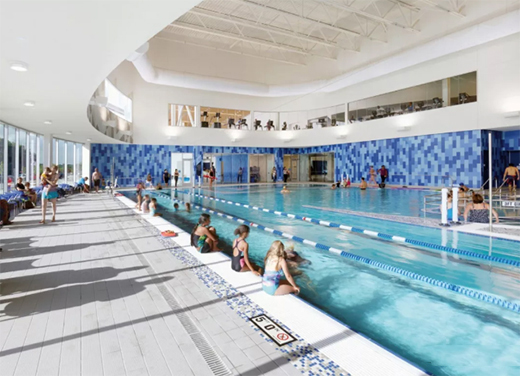 該建筑在平面上進(jìn)行了有機(jī)調(diào)整,進(jìn)一步遮蔽了進(jìn)入展館的廣場(chǎng),使來訪者在進(jìn)入建筑時(shí)能夠免受公路噪音和交通的影響。同時(shí),透明的立面展示了進(jìn)行健康和娛樂活動(dòng)的社區(qū)公共生活場(chǎng)景。泳池位于建筑南端的圓形場(chǎng)地,最大限度地享受陽光。從總體上看,各種各樣的社區(qū)功能被整合在這個(gè)被抬升的景觀建筑的內(nèi)部和外部中。