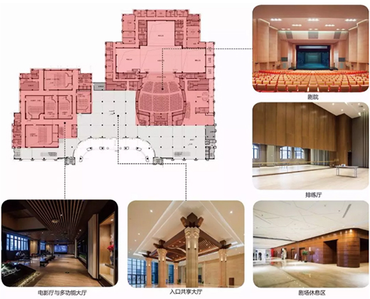 建筑布局呈東西朝向,共分為3大功能區(qū):中區(qū)為入口共享大廳,北區(qū)為劇院及排練廳,南區(qū)為影廳與多功能大廳。建筑內(nèi)部還設(shè)置了餐飲、精品店、咖啡廳、展廳等商業(yè)文化設(shè)施。這是一座功能復(fù)雜、規(guī)模宏大的綜合文化中心。