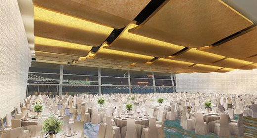 宴會(huì)廳,波浪形頂部與窗外波光粼粼的江面遙相呼應(yīng)
