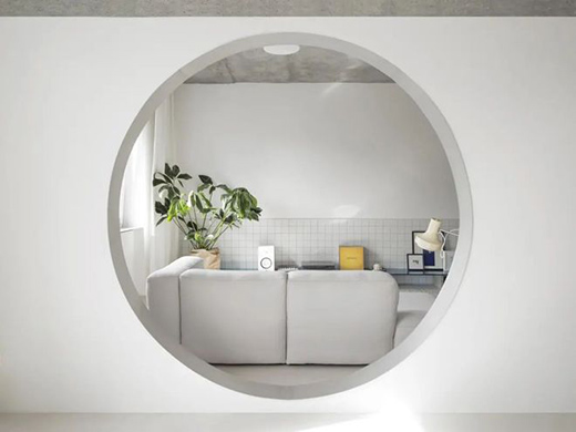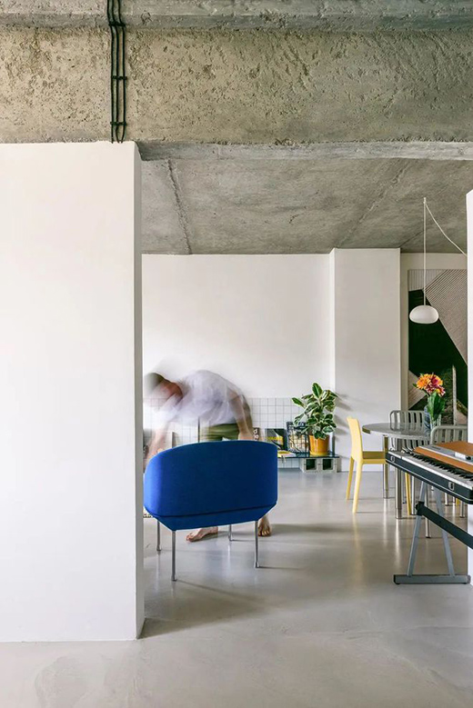 公共空間和半開放式廚房之間留有圓形門洞,起居室下方是一個(gè)由廢混凝土塊和藍(lán)色玻璃制成的架子。
