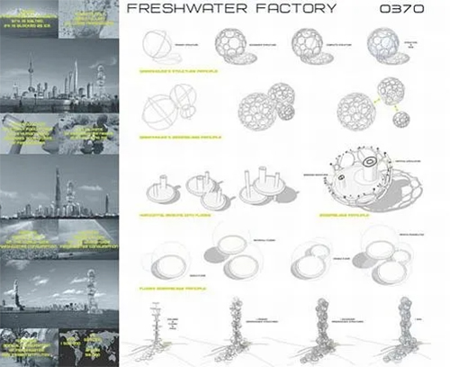 建筑師最初的理念是建造一座全無電力消耗的海水凈化系統(tǒng)的摩天大廈。正如淡水工廠的名字,這座生態(tài)塔用了一系列的紅樹群濾水設(shè)施(water-filtering mangroves)的“泡泡”,能將海水通過一種可持續(xù)的方法轉(zhuǎn)合成淡水。