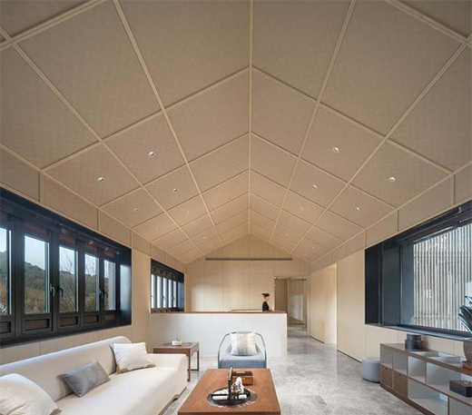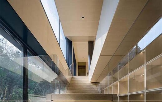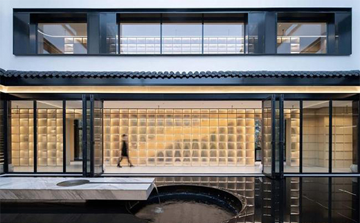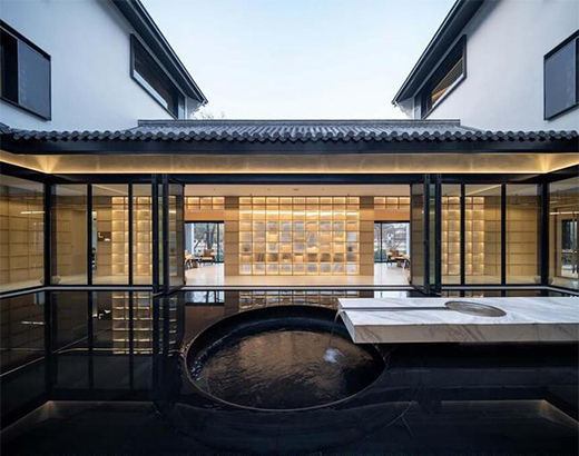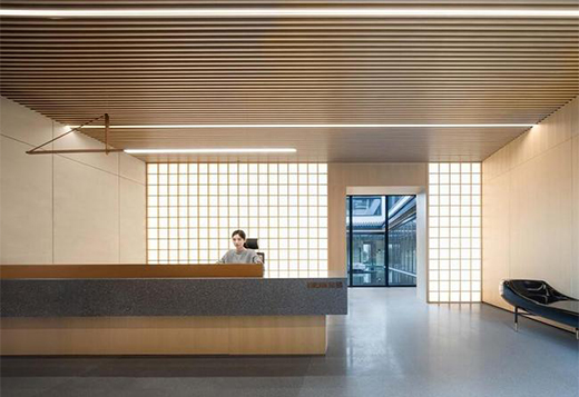 設(shè)計(jì)者在建筑內(nèi)部創(chuàng)造出新的景觀,通過景觀化的公共空間處理,營(yíng)造出和諧穩(wěn)定的工作氛圍。以中庭為視覺核心,結(jié)合中庭四周傾斜的屋頂,設(shè)計(jì)師將庭院變成水景,在下雨的時(shí)候,雨水從屋檐滴落,四水歸堂,靜致遠(yuǎn)。中庭四周都是落地玻璃,模糊了室內(nèi)和室外的界限。在環(huán)廊內(nèi)側(cè),用"木屏"代替實(shí)墻,半透明的 U形玻璃將場(chǎng)地內(nèi)的綠色隱約可見地延伸到室內(nèi),在隔開空間的同時(shí),保持功能性和私密性,營(yíng)造出曖昧而有趣的空間氛圍。傳統(tǒng)中式建筑中保留的“有機(jī)”與改造設(shè)計(jì)中新建立的“正交”,最終碰撞在建筑立面上,帶來強(qiáng)烈的視覺沖擊,不同元素間形成微妙的平衡。