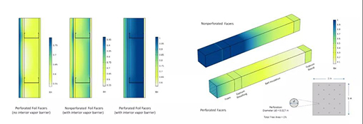 穿孔與無穿孔箔面隔熱層的仿真結(jié)果對(duì)比圖。在隔熱層上增加孔眼可以改善冬季穩(wěn)定條件下建筑維護(hù)結(jié)構(gòu)的防潮性能。圖片由 Steven Doggett 提供。