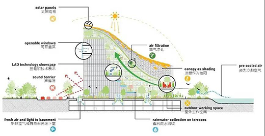 這個鋪滿綠植的退臺設(shè)計起到了空氣凈化、調(diào)節(jié)微氣候以及美化環(huán)境的作用,也間接為農(nóng)業(yè)生產(chǎn)和公共教育做出了貢獻。