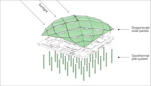 園區(qū)計劃于2021年底開放,這是谷歌在新冠疫情導(dǎo)致相關(guān)業(yè)務(wù)關(guān)閉后重返辦公室戰(zhàn)略的一部分,通過太陽能電池板和地?zé)崮艿娜诤鲜惯@個新園區(qū)完全變成零碳建筑,實現(xiàn)園區(qū)無碳排放。
