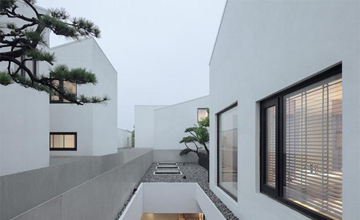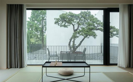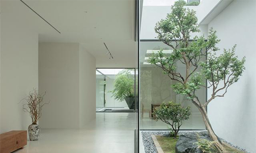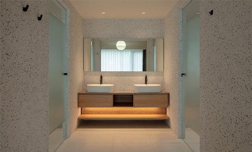 室內(nèi)公共空間部分,整體以白色簡約為主:墻面和天花選用米白紋理涂料,地面為白色水磨石。這種空間,能很好地襯托出天井帶來的光線變化。此外,可滿足公共空間布展的功能要求。公眾開放區(qū)內(nèi),本公司還設(shè)置了木質(zhì)固定家具,與植物和活動(dòng)家具相結(jié)合,形成開放式起居室空間。內(nèi)房部分,深色和淺色兩種顏色搭配。材料選用同一種材料:地面為水磨石,墻面及天花采用肌理涂料。對(duì)于沙發(fā)區(qū)域、臥室區(qū)域、辦公室區(qū)域選用較為柔和自然的木飾面材料。在淋浴區(qū)域選擇以小顆粒為底料的水洗石,不僅增加了空間的肌理質(zhì)感,而且起到很好的防滑效果。