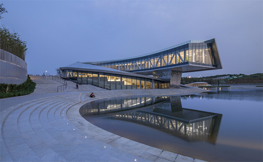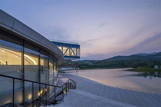 行云流水的“運筆”凝練著眼下水光的盈動與遠處群山的渾厚,直至最高處端頭近13米懸挑的“頓筆”,意欲將建筑與山水在此交融,“回鋒”的筆觸在場地中余韻未消,留下湖邊步道蜿蜒曲折,順應著建筑的流動曲線向外延伸,自然地將建筑形態(tài)過渡至戶外空間。