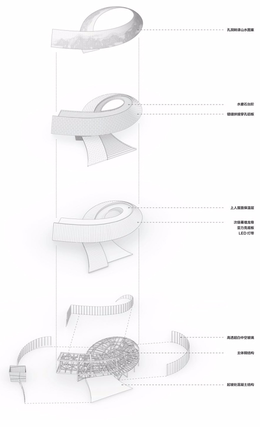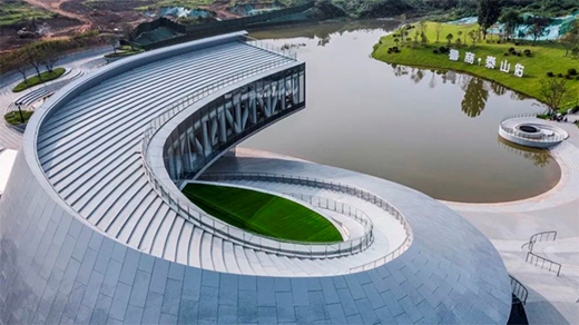 建筑從地面自然生長而起,一氣呵成,以盤旋上升的姿態(tài)化作遠處巍峨山勢的延續(xù),以舒展的曲線造型回應群山環(huán)抱的自然環(huán)境,同時巧妙地化解場地高差,順勢連接東西兩側(cè)的公共空間。