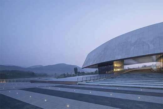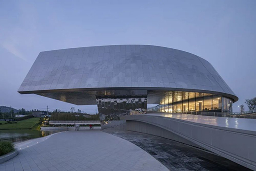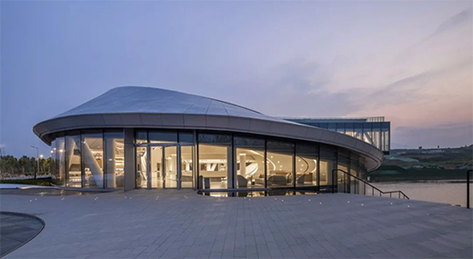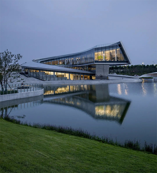 當夜幕降臨時,銀灰色幕墻曲線隨著天光產(chǎn)生微妙的變化,倒映在粼粼的湖水中,與連綿起伏的泰山遙相呼應,將建筑融于場地和環(huán)境之中。