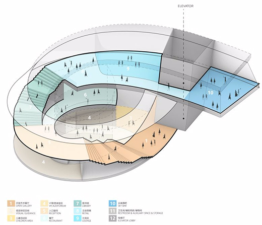 開放藝術(shù)展廳和圖書館布置在最為核心的臺階區(qū)域,由入口接待功能銜接;穿過沙龍及文創(chuàng)銷售區(qū),人們最終來到云端咖啡廳,遠眺泰山。