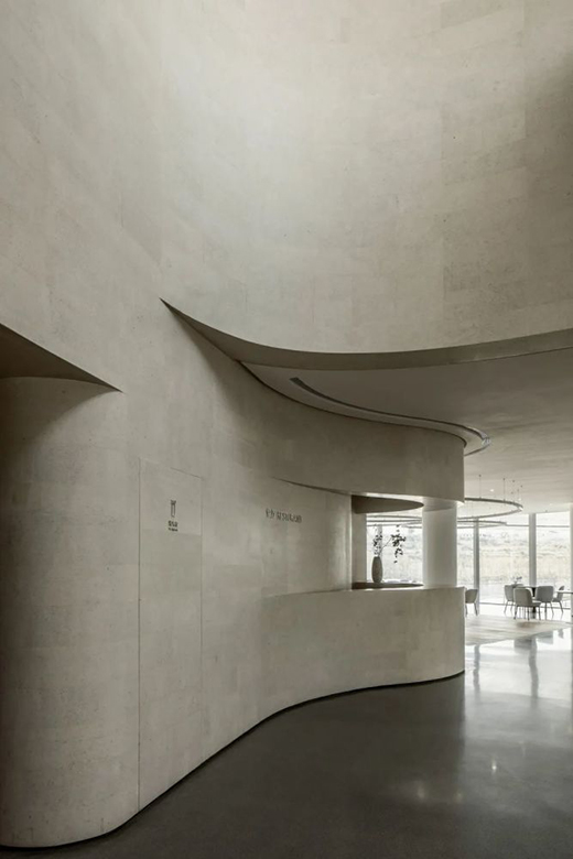 柔和的連續(xù)曲線作為整體設計語言在室內(nèi)空間中得到延續(xù)。石材的厚重感和穩(wěn)定的肌理突顯空間的沉穩(wěn),整體的素色體系則強化了空間的靜謐感。
