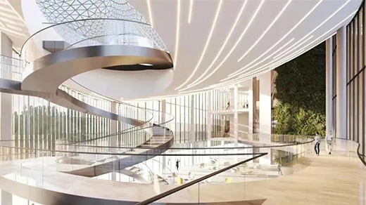 建筑地上4層,地下1層,高24m,由南北2個體塊和中央大廳組成。兩側(cè)體塊結(jié)構(gòu)上形成錨點,屋頂造型采用側(cè)拉結(jié)構(gòu),創(chuàng)造開闊的挑空大廳。