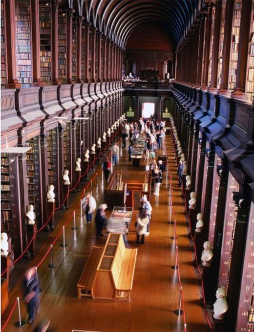 站在方形廣場上,30米高的鐘樓就在你的面前,廣場另一頭是老圖書館大樓,其中心區(qū)域是令人嘆為觀止的長廳(Long Room),電影《星球大戰(zhàn)前傳Ⅱ:克隆人的進(jìn)攻》中,杰迪武士檔案館便是以此為原型設(shè)計(jì)的。