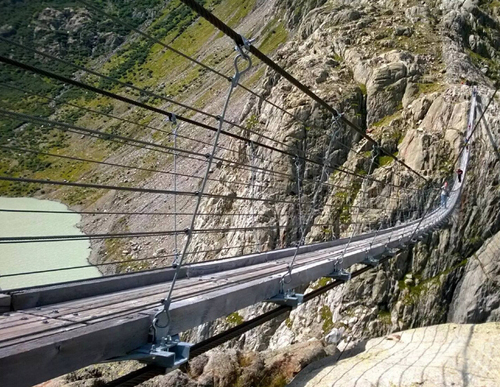 在所有懸索橋中,最令人驚心動(dòng)魄的應(yīng)該就是特里夫特懸索橋了。該橋長(zhǎng)170米,跨伯爾尼高地的特里夫特斯湖,湖面與橋之間無(wú)任何連接,湖光山色冰川美景盡收眼底,每年吸引著成千上萬(wàn)名渡橋者前來(lái)游覽。