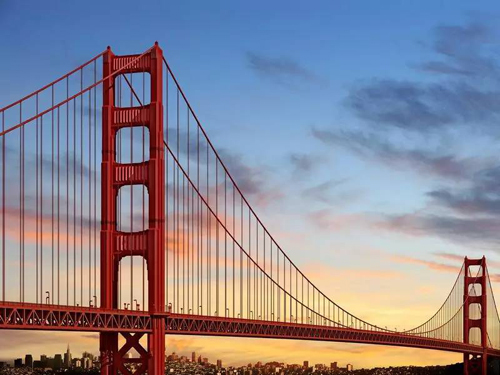 位于美國(guó)舊金山的金門大橋是世界著名的橋梁之一,也是近代橋梁工程的一項(xiàng)奇跡。大橋雄峙于美國(guó)加利福尼亞州長(zhǎng)1900多米的金門海峽之上,歷時(shí)4年,利用10萬(wàn)多噸鋼材,耗資達(dá)3550萬(wàn)美元建成。橋長(zhǎng)共2.7公里,橋體為橙色,跨度驚人。該橋于1937年對(duì)外開(kāi)放,由工程師兼詩(shī)人約瑟夫·施特勞斯設(shè)計(jì),其講究的懸架結(jié)構(gòu)和優(yōu)美的藝術(shù)裝飾塔令人贊嘆不已。