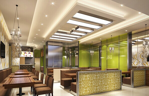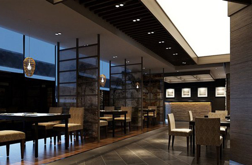 考慮到空間小這一因素,我們可以通過吊頂或者地板高度材質(zhì)的不同來分隔空間,卡座與卡座之間可以用一些裝飾物來遮擋,這樣在視覺上會(huì)顯得較為開闊,長(zhǎng)型餐桌可以靠墻放置,讓走道更為寬敞,以此來造成空間增大的效果。