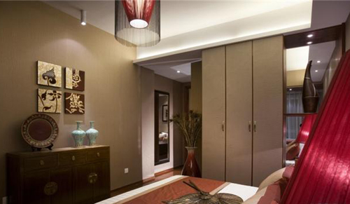 臥室櫥柜、衣柜等方面的設(shè)計(jì),顏色搭配以深色,加之原木色地面,烘托出復(fù)古格調(diào)。臥室櫥柜上擺放的青花瓷瓶,美麗而不呆板、巧妙而不雜亂。