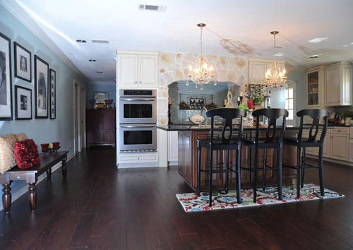 仿古木地板顯得高雅并易清潔,配以獨特的酒柜設計,加上古典的燈打出效果,非常不錯。飯廳地板要耐臟,勤打掃。