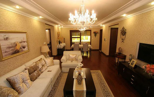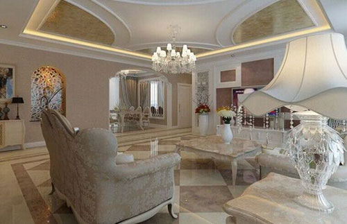 光線從天花板折射出來,既不刺眼,而日光燈所發(fā)出的光線最接近太陽光,對于采光不足的客廳而言最為適合,客廳內(nèi)使用凹位造型吊頂,可以緩解天面形成的壓抑感。