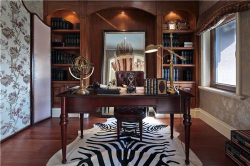 看到這款美式書房大家有何感想呢?它穩(wěn)重而不沉悶,嵌入式的實木儲物柜成為一面不錯的背景墻,凹凸有致的造型設計讓書房更具空間層次感,斑馬紋理的地毯具有調(diào)節(jié)空間氣氛的效果,精美的花紋壁紙同樣具有柔化凝重氣氛的效果。