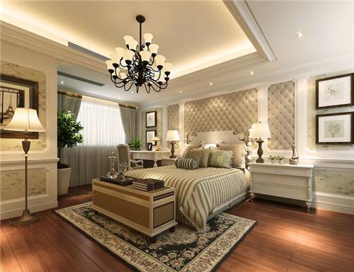 寬敞的臥室選擇用實木地板來裝點地面,給人舒適的觸感,淺灰色的地毯搭配穩(wěn)重色彩的床品恰到好處,做工精湛的美式儲物柜依墻而設,舒時尚的吊燈彌補著上層空間的單調(diào)感。