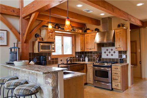 這款美式別墅廚房以實木為主,打造出一幅回歸大自然的生活畫面,不同尋常的空間布局讓廚房風格杯具一個,最具特色的要數(shù)那假房梁與立柱,為空間帶來了別樣的設計元素。