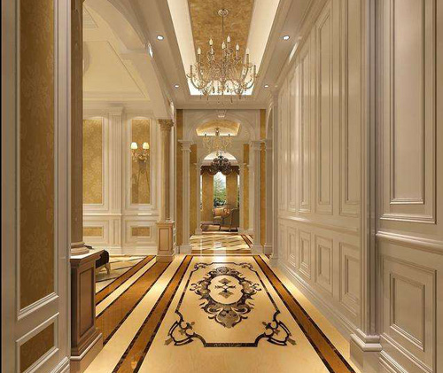 室內過道的地面設計建議使用耐磨易清潔的材料,地磚的花紋或者木地板的花紋最好橫向排布。地面的顏色可比頂面稍深,也可以區(qū)別于相鄰空間,但是也不宜太深。