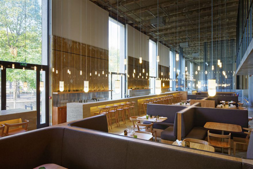 去年12月,東京廣受歡迎的餐館“東京餐”(Tokyo Eat)關(guān)閉后,小眾酒店集團(niche hospitality group)推出了一家新的、誘人的餐廳。由黎巴嫩建筑師Lina Ghotmeh設(shè)計。餐廳的室內(nèi)設(shè)計有簡潔的線條和一定程度的極簡主義,空間的延伸尺寸令人愉悅。Les Grands Verres有一個相鄰的雞尾酒吧和休息室叫Readymade,它的特點是一個13米超長雞尾酒吧臺,一個個小空間,更強調(diào)私密氛圍的用餐環(huán)境;半透明的落地大窗能隱約看到埃菲爾鐵塔。