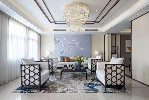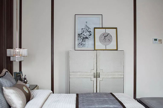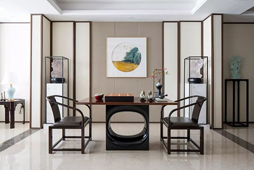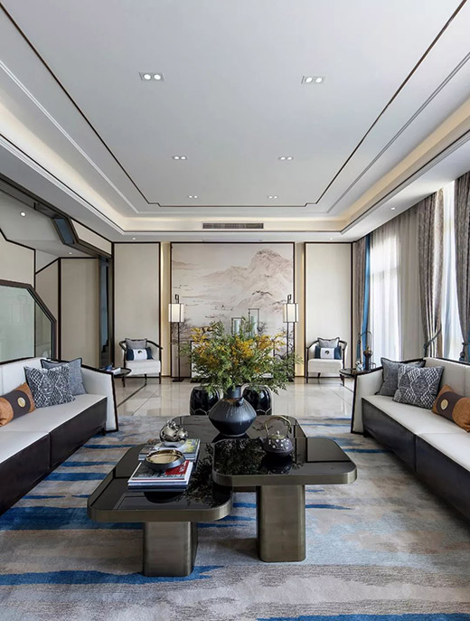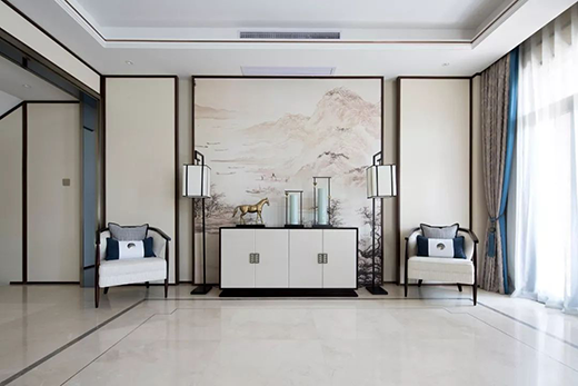 客廳空間清朗開闊,左右通透的玻璃窗,簡練的布置和精美的裝飾,讓人有賓至如歸之感。入口門廳處,背景墻為一幅極為清雋的人文山水畫卷圖,近乎白描的線條,抒寫著山水悠然意境,讓自然情趣在空間自然彌漫,兩側(cè)放置簡雅的新中式地燈、圈椅,將《宋史》中所提及的“耳目清曠,不設(shè)機關(guān)以待人,心安閑而體舒放”的自在感納入空間。