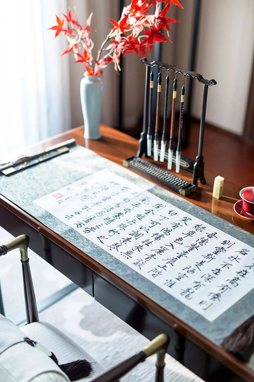 中式風格的空間,自然流露出一種經(jīng)久不息的古典氣質(zhì),以高潔素雅為尚。在書法室的呈現(xiàn)中,清貴之氣與書卷氣交融。“不要人夸顏色好,只留清氣滿乾坤,”元代詩人王冕的詩句,洋溢著磊落浩然之氣,也凝煉在這個空間中。