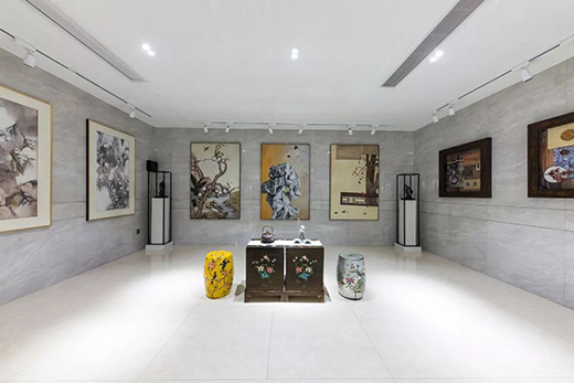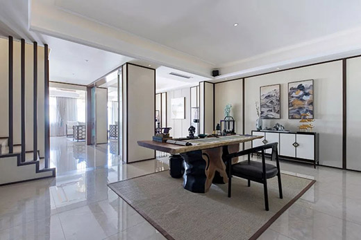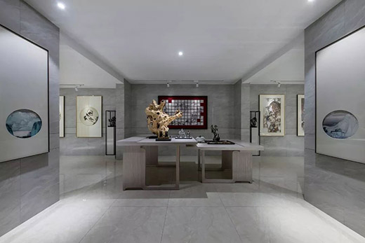 在負二層空間,特辟有一個遠離世俗的藝術(shù)展示空間,設(shè)計以東方式的“留白”美學控制空間節(jié)奏,素色的水磨大理石背景奠定了空間清雅的氣質(zhì),于低調(diào)內(nèi)斂中,彰顯出大家風范。藝術(shù)擺件、墻上的掛畫無論是數(shù)量還是內(nèi)容,都不會過于蕪雜,主要以藝術(shù)的豐厚來營造悠悠意境。