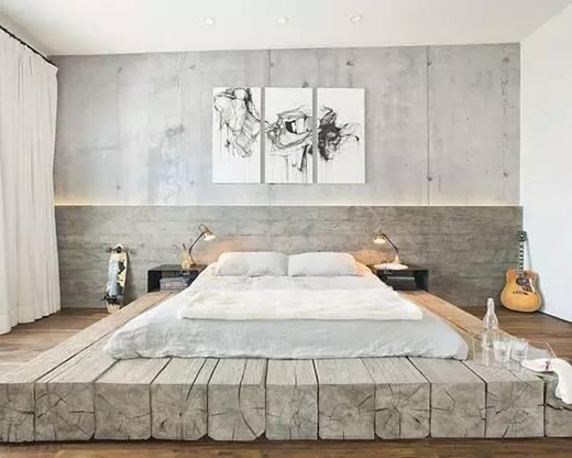 層次設(shè)計。原木床古樸的肌理展示給我們一種自然的親切,床頭以木板和混凝土做出錯落的層次設(shè)計,簡約但不簡單,搭配三幅水墨拼接畫,讓房間內(nèi)韻味無窮。