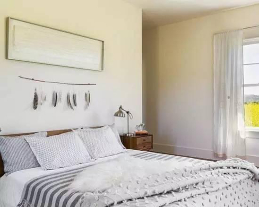 DIY小物件。這款臥室床頭架構(gòu)了一小小的個羽毛垂簾,DIY形式裝飾床頭背景墻,填充了床頭的單身空白。家居生活中DIY的形式帶著一種無可取代的回憶特質(zhì),帶來絲絲溫馨情致。