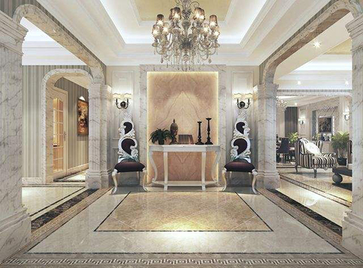 簡歐風(fēng)格的別墅客廳,傳承了歐式風(fēng)格特點(diǎn),追求奢華大氣的整體效果。例如客廳的地面選擇大理石,具有光澤的表面增添了房屋質(zhì)感,中間懸掛大型水晶吊頂,營造豪華的效果。從整體到局部,簡歐別墅都通過精雕細(xì)琢,給人一絲不茍的印象。