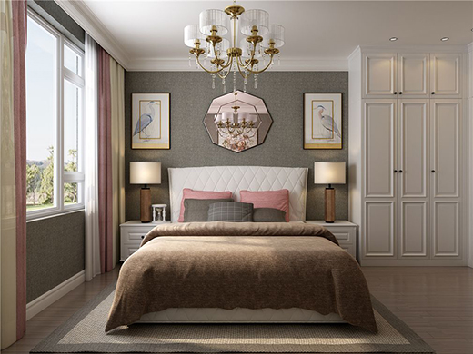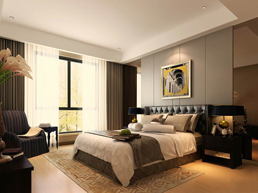 主臥室的裝修:墻面由于家具會(huì)將其面積遮蓋掉三分之一,使得人的視線基本上會(huì)落在除床頭上方位置之外的家具上,因此裝飾墻面的物品不高太過(guò)復(fù)雜,床頭上方空間則可以裝扮得個(gè)性化。