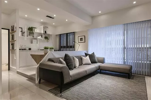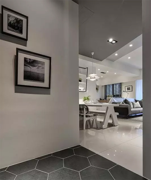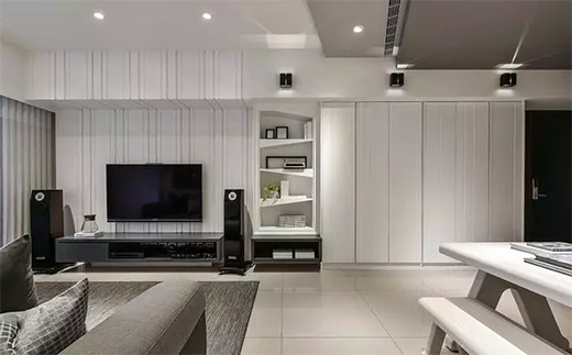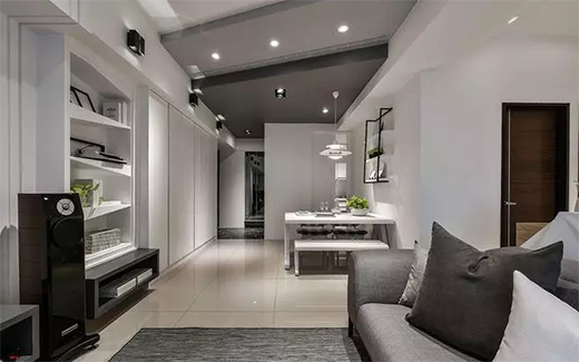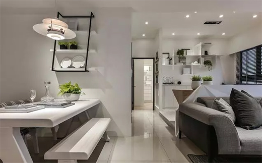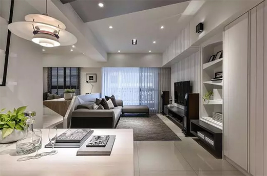 這個簡約風(fēng)裝修的大兩居,在色彩布局上基本是以白色加深灰色外帶一點(diǎn)黑色調(diào)的裝飾,所以整體效果顯得特別干凈,優(yōu)雅~對于愛干凈的人士來說,這樣的家想必是非常適合的