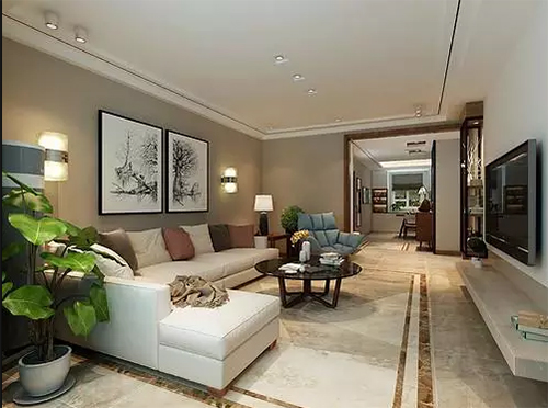 色澤柔和的駝色作為空間背景,帶來溫暖的格調。L型米白色沙發(fā)柔軟舒適,搭配深淺不一的純色系靠包,混搭藍色方格沙發(fā)椅,在黑白掛畫的襯托下,空間簡約清麗。