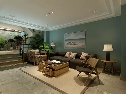 地下一層的客廳里,以純凈的海藍漆刷墻壁,宛如靜謐深沉的大海,配合著海景墻畫,仿佛有海風吹拂在空間里。深色的布藝沙發(fā),與實木椅、榫卯結構的茶幾,在綠植的點綴下,一派清新自然。